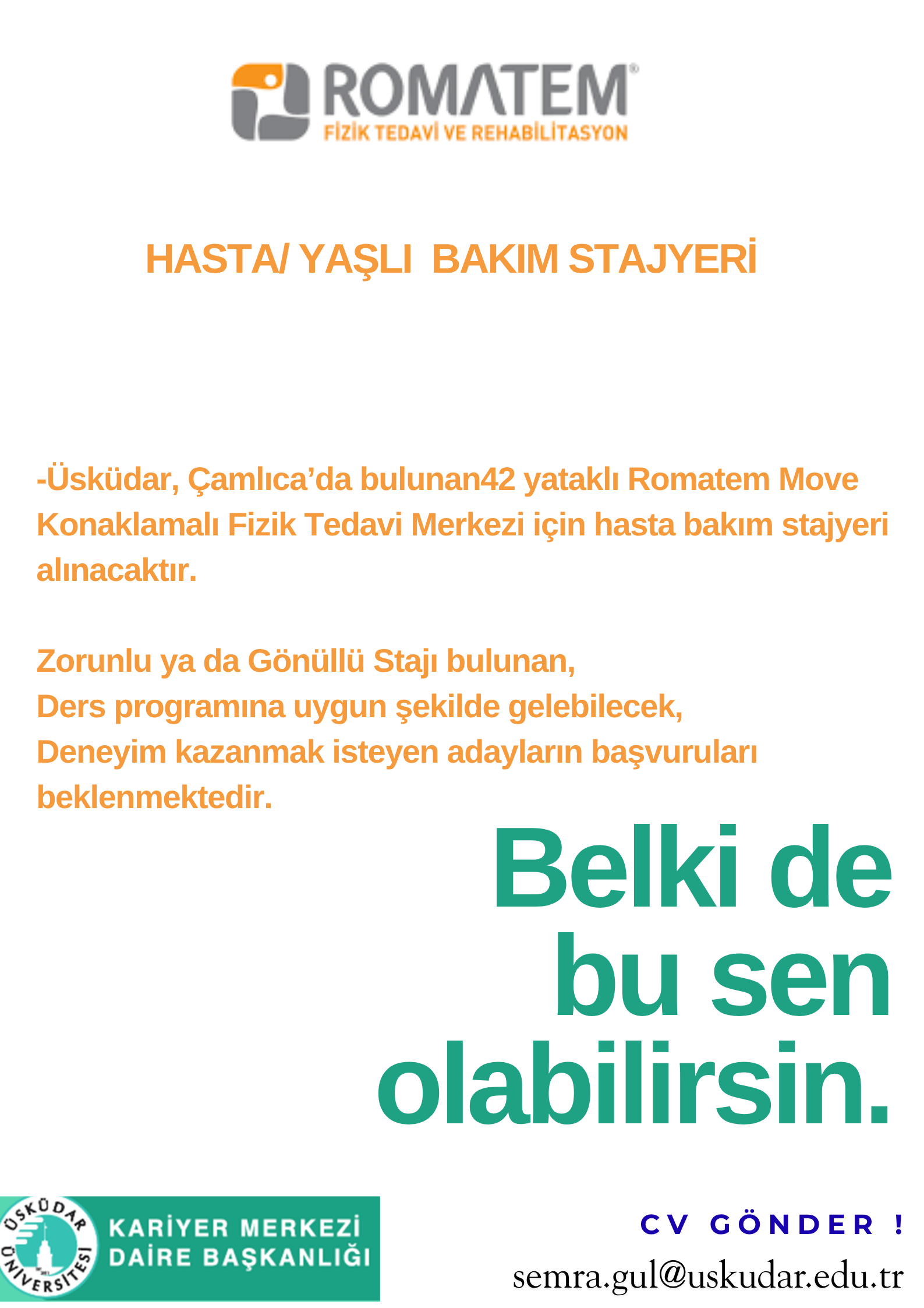 Üsküdar, Çamlıca’da bulunan42 yataklı Romatem Move Konaklamalı Fizik Tedavi Merkezi için hasta bakım stajyeri alınacaktır.