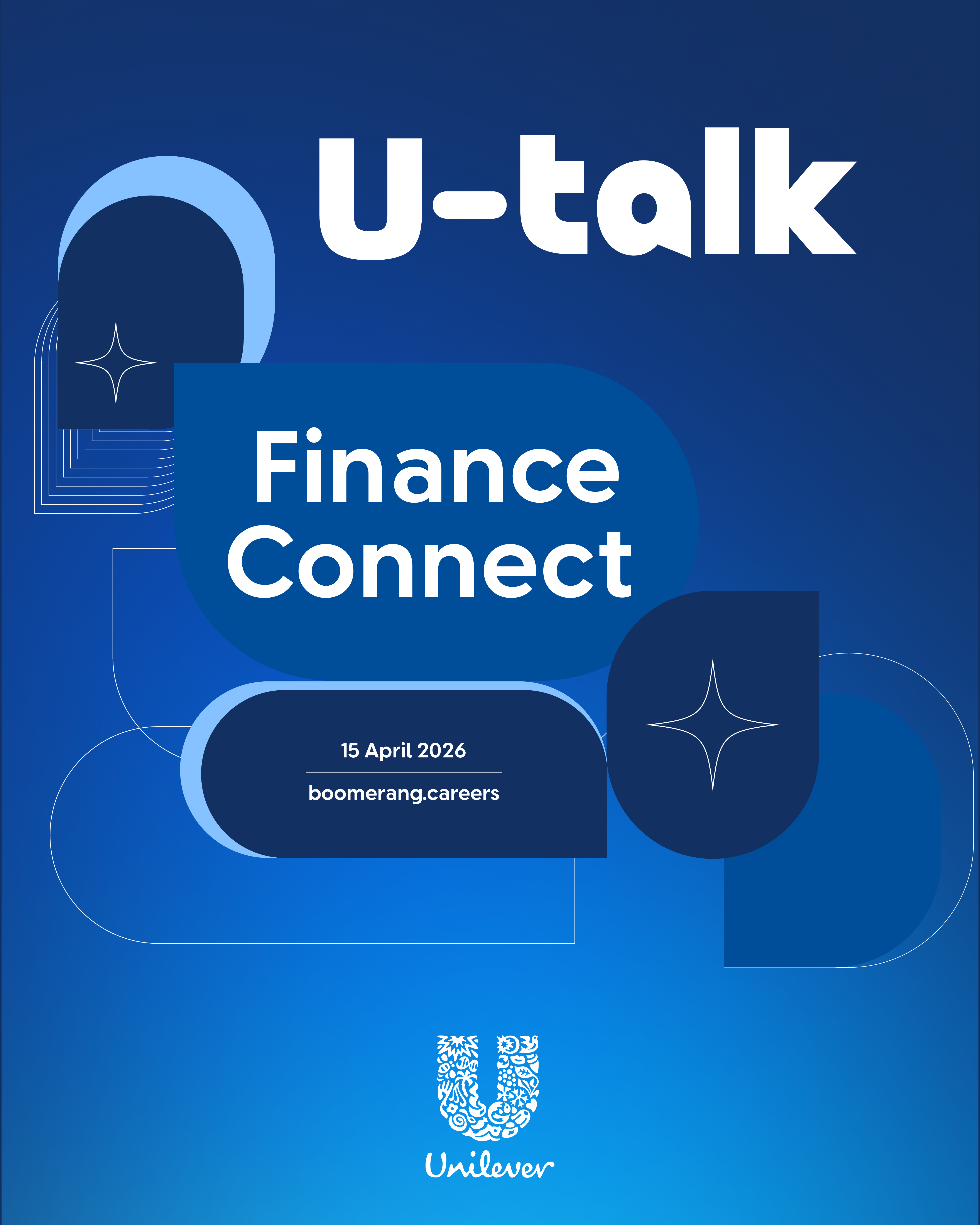 Unilever U-Talk Finance Connect, katılımcılarını ilham verici konuşmalar, güçlü içgörüler ve birebir etkileşim fırsatlarıyla buluşturacak özel bir deneyim sunuyor. Bu etkinlikte Unilever finans ekibini yakından tanıyabilir, farklı kariyer yolculuklarını dinleyerek finans dünyasına dair bakış açını geliştirebilirsin.